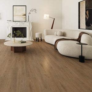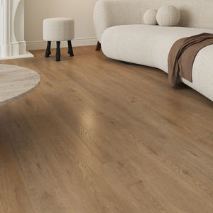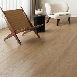 Embossage synchronisé effet chêne brossé, décor haute définition et traitement PU ultra-mat pour reproduire l'aspect et le toucher des plus beaux parquets.
